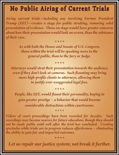 If trial become aired for the general public, the roots of legal process will suffer.  Live airing of the House and Senate of U.S. Congress has changed how Representatives and Senators behave.  Since video feeds entered Congress Floors, our Legislators speak to further their campaigning -- not bring proper legislations to the Floor.